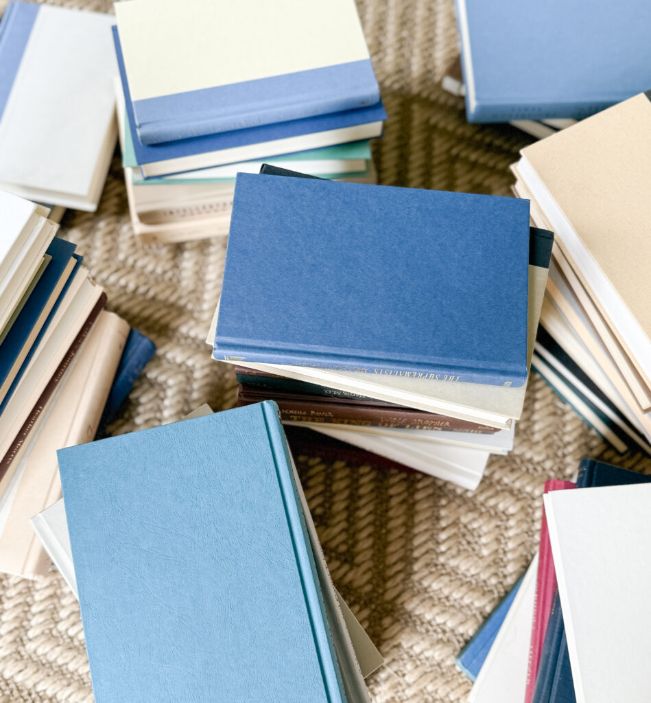 Next, I stack the books into piles based on their color. This makes styling later so much easier.