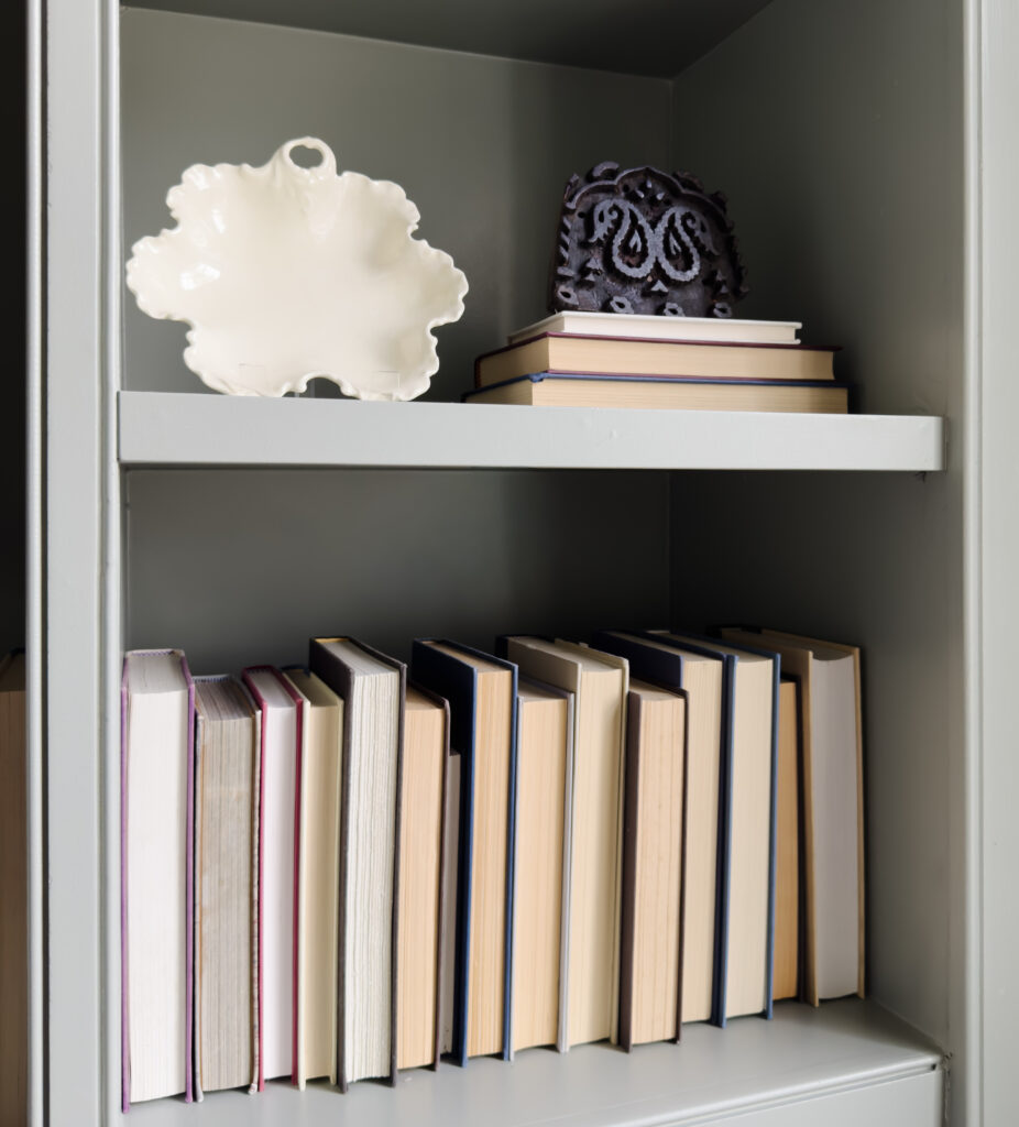 By grouping similar tones together ahead of time, I can distribute color evenly across the shelves instead of accidentally ending up with one dark corner and one very pale corner. The shelves feel balanced without looking overly styled or “done.”