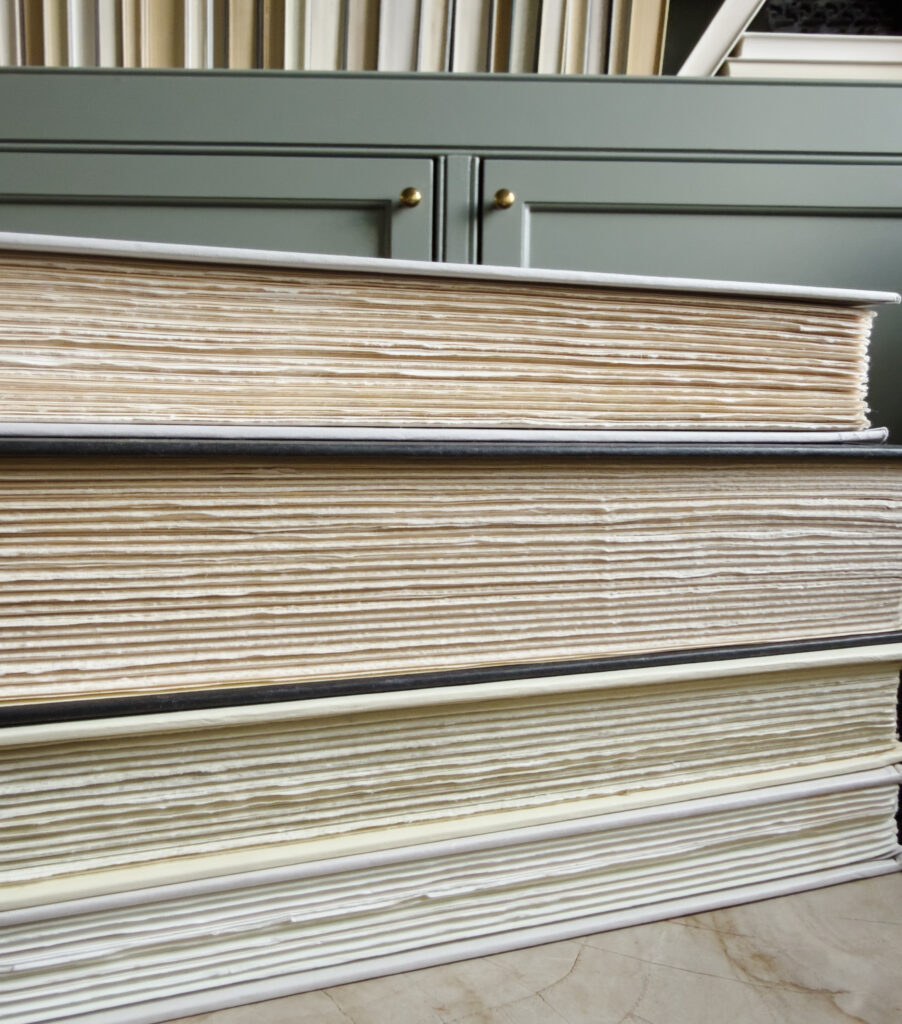 The goal here isn’t perfection- it’s cohesion. I’m looking for books that generally live in the same color family so the shelves feel calm and intentional once everything is installed. Bonus points for books with textured pages like this!